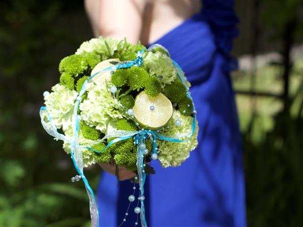 Brautstrauß mit Pfiff, ganz getreu dem Motto. Wir setzen Ihre Ideen blumisch um. Eine Hochzeit im Sommer in den Farben kiwigrün und türkisblau sollte trotz der leuchtenden Wirkung noch einen besonderen Pfiff bekommen. Grüne Limetten in den Brautstrauß, mittig hinein noch eine Perle, das ist mal etwas ganz anderes.