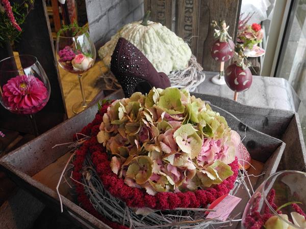 Rosa-bordeaux Hortensien mit herbstlich rotgefärbter Fette Henne zu zierlichen Kränzen gebunden, dazu silbergrüne Kürbisse, daneben in nostalgischer Tapete eingewickelte kleine Geschenke, mit weißer Spitze verziert - so entsteht ein romantischer Vintage-Stil in Red.