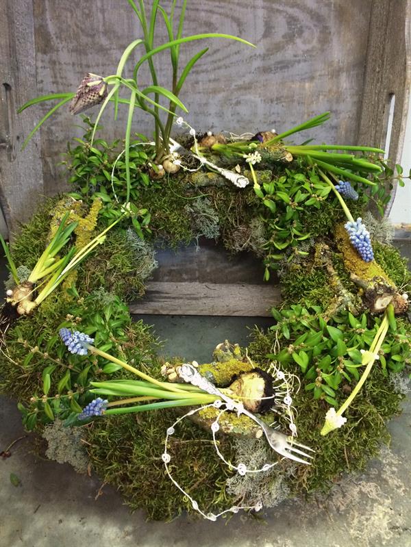 Türkränze, mit Zweigen verziert, Nester aus Buchs und Heu, die mit vielen Eiern und mit Frühlingsblumen gefüllt werden. Traubenhyazinthen, in blau oder weiß, Narzissen, mit Miniblüten und Schachbrettblumen eignen sich besonders gut dafür. Sie sind Zwiebelblumen und werden einfach mit einer Perlenschmucknadel durch die Zwiebel in das Nest fixiert. Die Wurzel täglich mit Wasser besprühen - schon kommen die schönsten Blüten zum Vorschein.