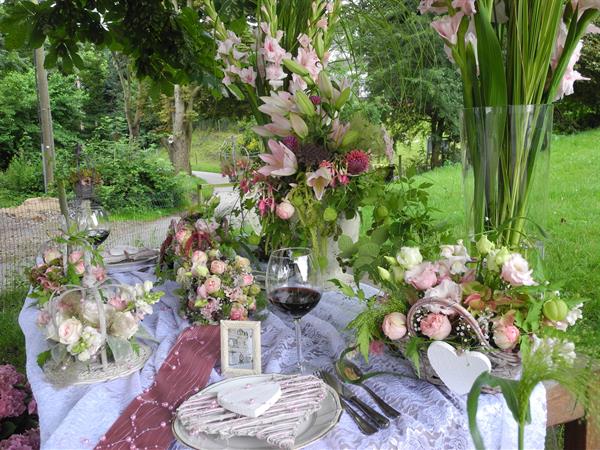 Eine Location auf dem Land - da liegt es nahe, die Hochzeit im Vintage-Look zu gestalten. Satte grüne Wiesen, große Bäume die Schatten spenden. Darunter eine romantisch gedeckte Hochzeitstafel in den Farben creme - altrosa.